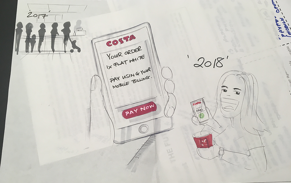 The remit for the day was to take a written pitch that had been submitted for consideration and build on the idea, by working with mentors from a number of consultancy companies, brought in by Costa (for example Fujitsu, Intel, Cambridge Design Partnership, plus a whole load of experts from Costa). Other people were on hand, for example cost and analysis experts and a great illustrator to make ideas come to life.