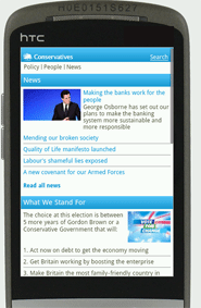 After searching for the main parties’ mobile sites, I found the Conservatives, http://m.conservatives.com/ , a good easy-to-remember url, credit to Rishi Saha, their Head of New Media. The site offers a summary of the party’s news, with photos and links to their policies. Overall the browsing experience was good.