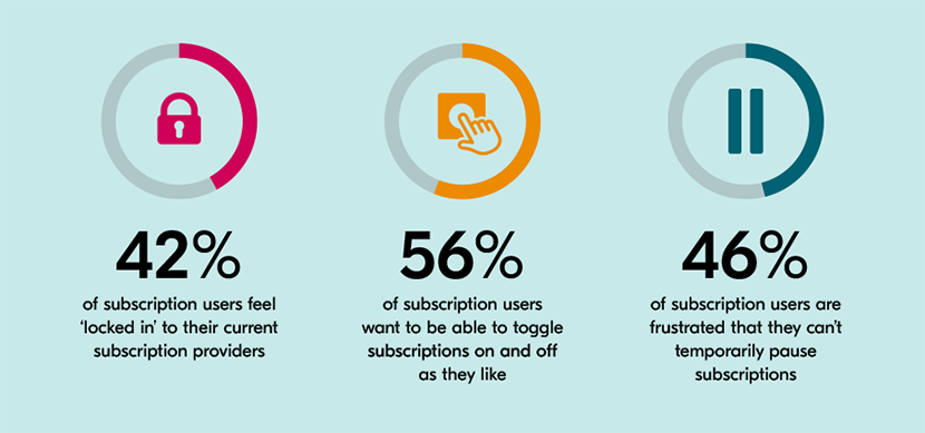 Almost half (46%) are frustrated that they can’t take ‘payment holidays’, temporarily pausing subscriptions, while 56% want to be able to toggle subscriptions on and off as they like.